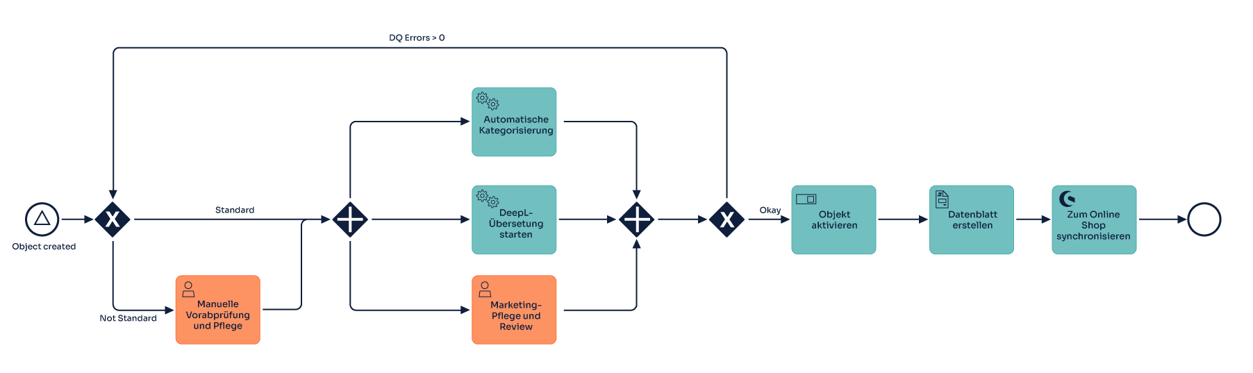 Ein neues Produkt wird angelegt → automatische Qualitätsprüfung → parallele Bearbeitung durch verschiedene Teams → finale Freigabe mit Datenblatt-Generierung. Die Grafik zu diese Workflow finden Sie unter Schritt 5.